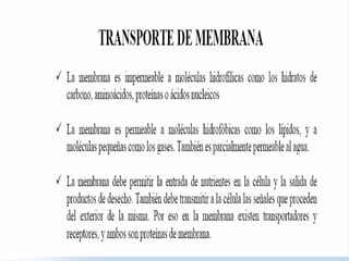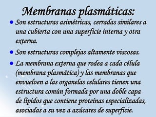 La membrana plasmática es una estructura asimétrica y compleja formada por una doble capa de lípidos, proteínas y glúcidos. Sirve como barrera selectiva entre el interior y exterior de la célula y de los orgánulos, permitiendo el transporte de sustancias. Realiza funciones como el transporte, reconocimiento, transducción de señales y proporciona sitios para enzimas a través de su modelo de mosaico fluido.