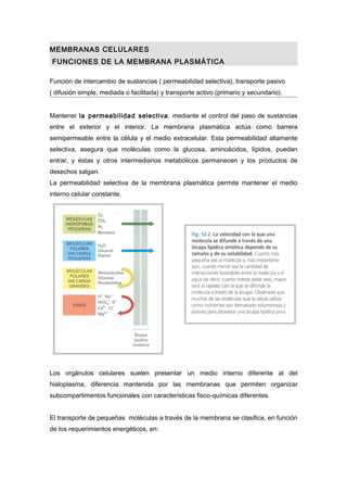 La membrana plasmática tiene tres funciones principales: 1) intercambio de sustancias a través de transporte pasivo y activo, 2) mantener la permeabilidad selectiva mediante el control del paso de sustancias entre el exterior y el interior de la célula, y 3) permitir la organización de subcompartimentos funcionales con características físico-químicas diferentes en los orgánulos celulares.