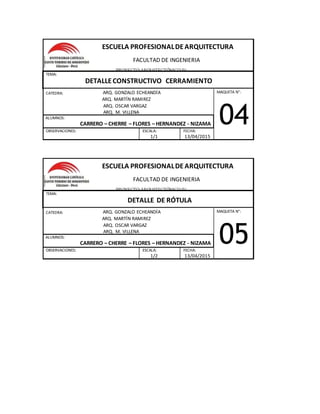 El documento presenta 5 maquetas realizadas por estudiantes de arquitectura sobre el National Gallery en Berlín para su proyecto arquitectónico IV. Las maquetas incluyen una maqueta general a escala 1/250, una sección constructiva a escala 1/20, y detalles constructivos de encuentro de losa a escala 1/10, cerramiento a escala 1/1, y de rótula a escala 1/2. Las maquetas fueron realizadas el 13 de abril de 2015 para la cátedra de los arquitectos Eche