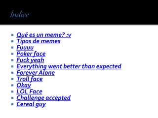 Este documento describe varios tipos populares de memes de Internet, incluyendo Fuuu, Poker Face, Fuck Yeah, Everything Went Better Than Expected, Forever Alone, Troll Face, Okay, LOL Face, Challenge Accepted y Cereal Guy. Explica brevemente el origen y significado de cada uno de estos memes comunes.