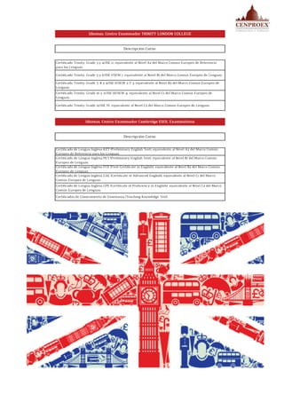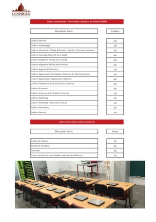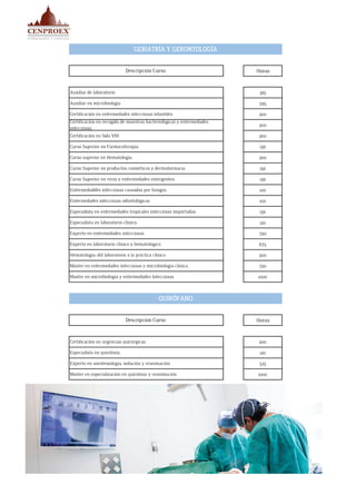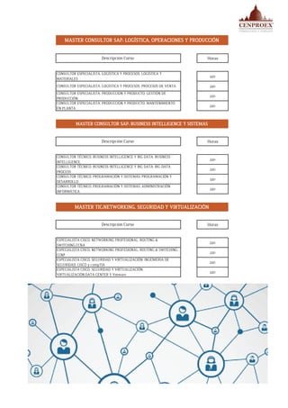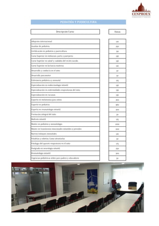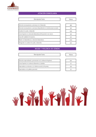 Este documento presenta la oferta formativa de una empresa llamada CENPROEX. Incluye información sobre sus infraestructuras, acreditaciones, convenios de colaboración, acciones formativas impartidas para organismos públicos y privados, proyectos internacionales, y una invitación a conocer sus servicios.