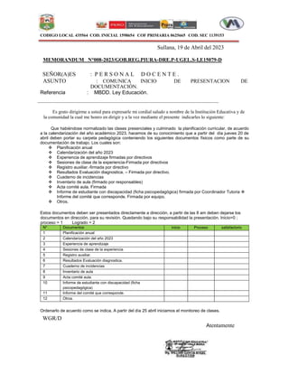 El memorándum comunica al personal docente que deben presentar una carpeta con documentos de planificación y evaluación a partir del 20 de abril para su revisión, incluyendo el plan anual, calendarización, experiencias de aprendizaje firmadas, sesiones de clase, registro auxiliar, evaluaciones diagnósticas, cuaderno de incidencias, inventario de aula, actas de comité, informes de estudiantes con discapacidad e informes de comité. Además, indica que a partir del 25 de abril iniciarán el monitoreo de cl