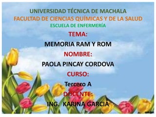 La memoria RAM o principal es donde el computador guarda temporalmente los datos y programas que está utilizando. Los datos solo permanecen en la RAM mientras el computador esté encendido. La RAM permite acceder a cualquier ubicación de forma aleatoria y rápida. Existen dos tipos básicos de RAM: la DRAM, que necesita ser refrescada constantemente, y la SRAM, que es más rápida pero también más costosa.