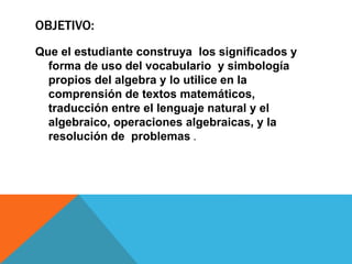Este documento presenta definiciones de términos clave del álgebra como término algebraico, signo, coeficiente, variable, exponente, monomio, binomio, trinomio, polinomio, grado respecto a una variable, grado absoluto, literales utilizadas como constantes y expresión algebraica. El objetivo es que los estudiantes aprendan y utilicen estos conceptos y la simbología del álgebra para comprender textos matemáticos y resolver problemas.