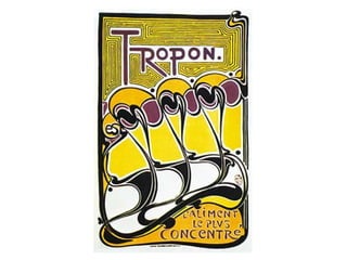 El documento describe a varios artistas pioneros del movimiento Art Nouveau entre finales del siglo XIX y principios del siglo XX. Jules Cheret dominó la litografía a color y representó la belleza y energía femenina. Eugène Grasset se inspiró en el arte medieval y oriental. Theophile Steinlen ilustró la pobreza y clase trabajadora con un estilo realista. Toulouse-Lautrec capturó la vida nocturna de París con gran maestría litográfica. Mucha y Bradley contribuyeron al estilo ornamental del Art Nou