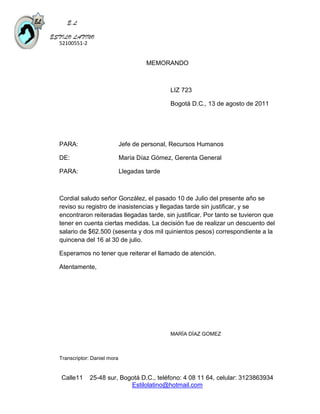El primer memorando informa sobre una reunión urgente el 24 de agosto para tratar temas relacionados con la nueva organización de vigilancia nocturna. El segundo memorando notifica sobre un descuento salarial a un empleado por llegadas tarde repetidas sin justificar. El tercer memorando solicita urgentemente el informe de salidas de almacén de junio para la auditoría del próximo mes.