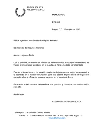 El memorando es un llamado de atención al Ingeniero José Ernesto Rodríguez por llegar tarde al trabajo por tercera vez en el mes de julio. Se le pide que se presente a la oficina de recursos humanos el 28 de julio a las 2 p.m. para tratar el asunto de acuerdo al manual de funciones.