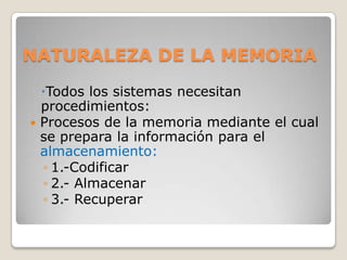 El documento describe los diferentes sistemas de memoria y factores que influyen en la memorización. La memoria se subdivide en memoria a corto plazo, que retiene información por pocos segundos, y memoria a largo plazo, que almacena información de por vida. La información pasa primero por la memoria sensorial e icónica antes de ser codificada, almacenada y recuperada en la memoria a corto y largo plazo. Factores como la atención, significado, repeticiones e interrelación con conocimientos previos a