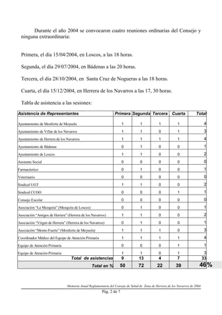 Este documento presenta la memoria anual del Consejo de Salud de Herrera de los Navarros de 2004. Detalla la composición del consejo, las cuatro reuniones celebradas durante el año, los temas discutidos como la atención sanitaria y prevención, y los datos de actividad del centro de salud como consultas médicas y de enfermería, urgencias atendidas y análisis realizados.