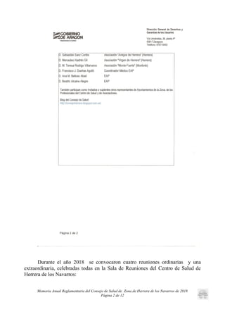 El documento presenta la memoria anual del Consejo de Salud de Herrera de los Navarros de 2018. Se realizaron cuatro reuniones ordinarias y una extraordinaria para tratar temas como la renovación del personal sanitario, mejoras tecnológicas, protocolos de violencia de género y cribado de cáncer. El centro de salud ofreció servicios como consultas médicas y de enfermería, pruebas diagnósticas y laboratorio.