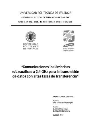 Este documento presenta un proyecto de grado sobre comunicaciones inalámbricas subacuáticas a 2,4 GHz para la transmisión de datos. Introduce el estado del arte de las comunicaciones subacuáticas basadas en ondas electromagnéticas, ópticas y acústicas. El proyecto mide la distancia máxima de cobertura y el rendimiento de sensores inalámbricos subacuáticos a diferentes tasas de transferencia y frecuencias usando 2,4 GHz. Adicionalmente, propone el diseño de un n