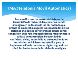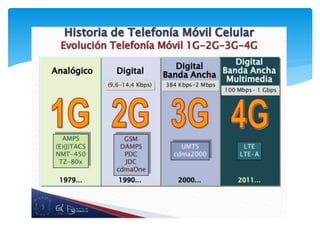 El documento describe los diferentes sistemas y tecnologías de telefonía móvil desde los analógicos iniciales hasta los actuales sistemas 4G. Explica que los sistemas celulares dividen el territorio en celdas cubiertas por estaciones base y cómo se han ido desarrollando tecnologías digitales como GSM, GPRS, UMTS, LTE y otras para proporcionar mayores velocidades de datos y nuevos servicios. También compara los principales operadores telefónicos en España y resume las diferentes bandas de frecuencias utilizadas