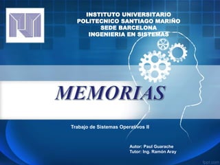 Este documento describe los diferentes tipos de memoria utilizados en computadoras, incluyendo RAM, ROM, memoria magnética, óptica y auxiliar. Explica las funciones, características y capacidades de cada tipo de memoria, así como su evolución a través del tiempo, desde los primeros desarrollos en el siglo XIX hasta las memorias modernas como DDR3. El documento concluye que la memoria es un componente crítico para el funcionamiento de una computadora.