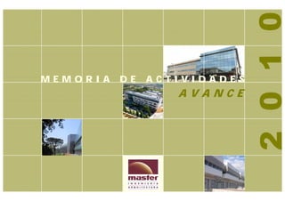El documento resume varios proyectos industriales y de arquitectura finalizados en 2010 y actualmente en curso. Entre los proyectos finalizados se encuentran la construcción de nuevas naves multiservicios, la remodelación de un laboratorio de control de calidad y la construcción de un nuevo centro tecnológico. Los proyectos en curso incluyen la construcción de una nueva planta farmacéutica, un complejo de investigación tecnológica y la expansión de un centro logístico.