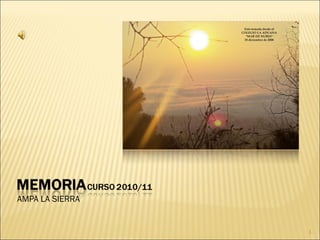 El documento resume las actividades realizadas por el AMPA durante el curso escolar 2010/2011, incluyendo la asistencia a reuniones, la gestión del seguro escolar y la venta de uniformes. También menciona eventos como la degustación de castañas y aceitunas, la decoración navideña y la entrega de regalos a los estudiantes por Reyes. El AMPA apoyó económicamente viajes, cortinas para las aulas y material musical. Finalmente, colaboró en la organización de diversos eventos escolares.
