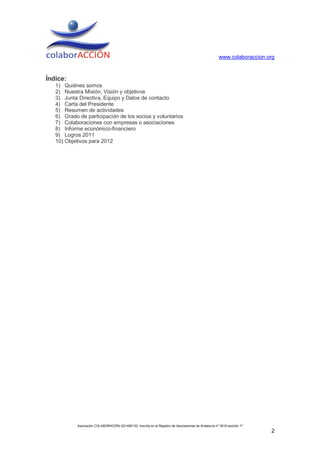 La asociación COLABORACIÓN se creó en 2010 para reducir la pobreza y promover un cambio de modelo de sociedad a través de la creación de empresas sociales. En 2011, realizaron actividades de sensibilización como un programa de radio y proyectos docentes. También participaron en la creación de la empresa social Consumo Gusto y su objetivo para 2012 es involucrar a estudiantes universitarios en más empresas sociales.