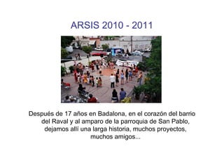 Este documento resume la primera experiencia de la Fundación ARSIS en Barcelona después de trasladarse desde Badalona debido a la crisis. Describe tres proyectos clave: el Servicio de Atención a la Infancia, Encuentra Empleo y formación online. A pesar de la reducción de recursos, ARSIS ha logrado estabilidad económica atendiendo proyectos prioritarios, reduciendo gastos y fortaleciendo la captación de fondos.