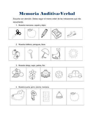 Se le pidió al participante que mostrara varios objetos en el orden especificado en una lista de instrucciones de 4 pasos. La lista incluía objetos comunes como manzanas, zapatos, lápices, ballenas, paraguas, llaves, abejas, sapos, pelotas, flores, puertas, gorros y piscinas.