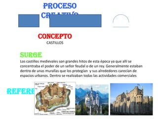 Los castillos medievales eran grandes fortalezas donde se concentraba el poder político y militar de los señores feudales y reyes. Generalmente estaban rodeados por murallas y carecían de áreas urbanas cercanas. Dentro de los castillos se llevaban a cabo todas las actividades comerciales, políticas y de gobierno.
