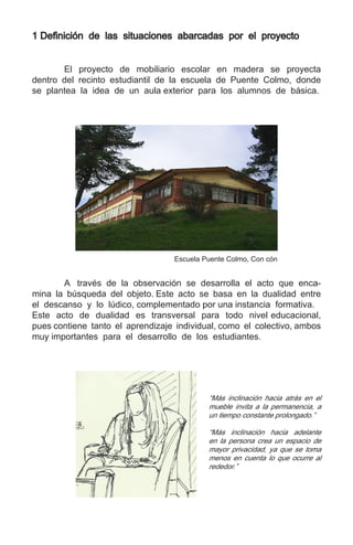 El documento describe el proceso de diseño de un mueble para un aula exterior de una escuela. Se presentan tres prototipos iniciales que intentan proporcionar tanto un espacio para el descanso como para la enseñanza. El diseño final consiste en un mueble de madera laminada con una curva que sirve como asiento y respaldo, y una mesa plegable que permite alternar entre momento de descanso y de estudio.