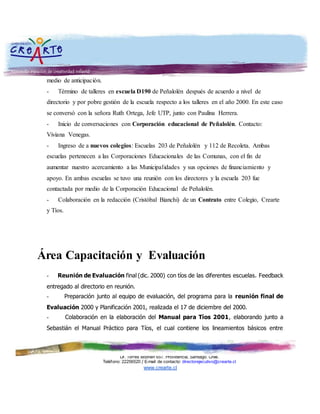 Este documento presenta un informe de gestión de una corporación chilena llamada Crearte durante el período de julio de 2000 a abril de 2001. El informe describe las actividades realizadas en áreas como gestión de talleres, capacitación y evaluación, reclutamiento, financiamiento, administración, marketing y coordinación. Algunas actividades clave incluyen la realización de un paseo a la playa con niños, el inicio de talleres en nuevas escuelas, la obtención de donaciones de empresas y la contratación de personal.