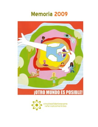 Este documento presenta las actividades de la organización Círculo Solidario de Navarra-Nafarroako Elkarbidea en 2009. La organización trabaja en proyectos de cooperación en Perú y El Salvador centrados en educación y salud, fortaleciendo infraestructuras, capacidades y organizaciones comunitarias. También realiza programas de educación para el desarrollo en Navarra sobre los Objetivos de Desarrollo del Milenio y la situación de las mujeres en Perú y El Salvador. La organización colabora con otras ONGD y fortalece su