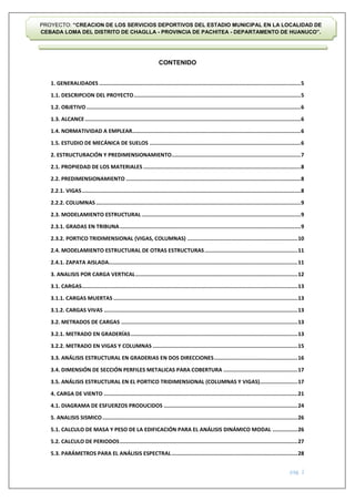El documento presenta el proyecto de creación de servicios deportivos en un estadio municipal en Huánuco, Perú. Se describe el alcance del proyecto y la normativa a emplear. Se realiza el predimensionamiento de vigas, columnas y otras estructuras mediante cálculos y el software Sap2000. Se analizarán las cargas verticales y de viento, y se realizará el análisis sísmico y diseño estructural de acuerdo a la normativa peruana.