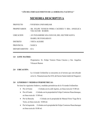 La memoria descriptiva describe una vivienda unifamiliar ubicada en la Av. Panamericana Sur en el distrito de Vista Alegre, Ica. La propiedad tiene un área de terreno de 150 m2 y un área techada total de 301.12 m2 repartidos en un primer piso de 143.81 m2 y un segundo piso de 157.31 m2. La vivienda cuenta con un restaurante, baños, almacenes, cocina en el primer piso y sala comedor, dormitorios, baños, cocina y pasadizo en el segundo piso.