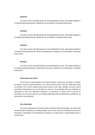 Este documento presenta la memoria descriptiva de un proyecto arquitectónico para un edificio corporativo de 10 niveles y 4 niveles de estacionamiento subterráneo para la marca Adidas en la Ciudad de México. El edificio tendrá un área total construida de 10,600 m2 y capacidad para 720 personas. Contará con espacios para ventas, administración, exhibiciones, eventos y áreas verdes.