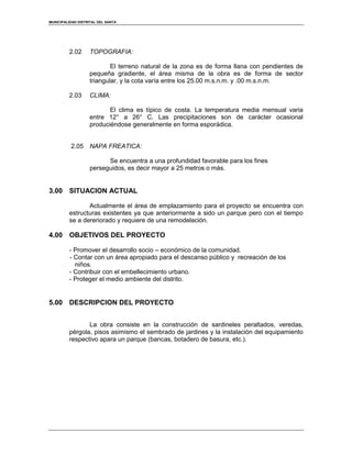 El documento describe los detalles de un proyecto para construir un parque recreativo en Javier Heraud, Santa, Ancash. Actualmente el terreno cuenta con algunas estructuras deterioradas y áreas verdes abandonadas. El proyecto tiene como objetivo promover el desarrollo de la comunidad local y brindar un espacio seguro y limpio para que los niños jueguen. Se realizó un levantamiento topográfico del terreno para obtener los datos necesarios para el diseño del parque.