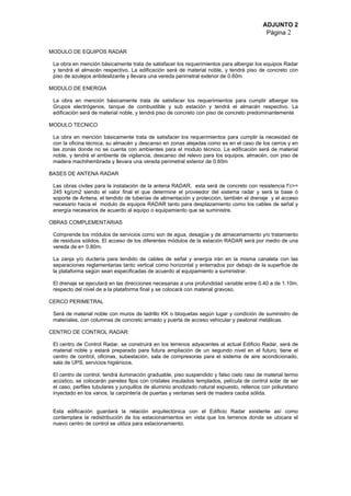 Este documento describe los planes para instalar sistemas RADAR en 8 ubicaciones en Perú. Se instalarán estaciones RADAR en cerros y aeropuertos. Cada estación incluirá plataformas, módulos para vigilancia, equipos, energía y técnicos. También se construirá un centro de control en Lima. El documento proporciona detalles sobre las características de cada ubicación y las especificaciones técnicas para las obras civiles.