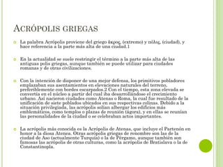 La acrópolis se refiere a la parte más alta y fortificada de las antiguas ciudades griegas, donde se construían los edificios más importantes como templos y plazas públicas. Los primeros pobladores griegos establecían sus asentamientos en colinas para defenderse mejor. Con el tiempo, estas zonas altas se convertían en el núcleo alrededor del cual crecía la ciudad. La acrópolis más famosa es la de Atenas, que incluye el Partenón dedicado a la diosa Atenea. Otras acró