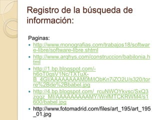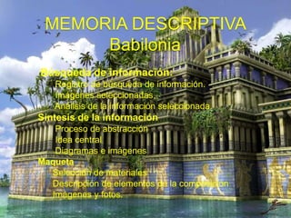 El documento describe la investigación y análisis de información sobre la antigua ciudad de Babilonia. Resume la búsqueda de información en línea y las imágenes seleccionadas. Luego analiza la información recolectada y sintetiza los hallazgos principales sobre la arquitectura y diseño urbano de Babilonia. Finalmente, describe el proceso de crear un modelo maquetado de la ciudad tomando como idea central su implantación urbanística.