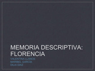 El documento describe la ciudad de Florencia, Italia. Florencia se originó como un asentamiento militar romano y se convirtió en un centro del Renacimiento en el siglo XV bajo el mecenazgo de la familia Medici. La maqueta representa lugares clave como la Plaza della Signoria, la Catedral de Santa María del Fiore, y el Puente Vecchio para mostrar la organización urbana y los aspectos políticos, religiosos y comerciales de Florencia.