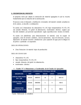 El documento describe un proyecto de explotación minera no metálica llamado "Kavasulu" en Perú. El proyecto extrae agregados como piedra, cascajillo y arena de una cantera. Actualmente el proyecto se encuentra en proceso de formalización de acuerdo con la ley peruana. El proyecto tiene una producción diaria de 60 m3 de materiales y reservas probadas de 71,940 m3 con una vida útil estimada de 10 años y 8 meses.