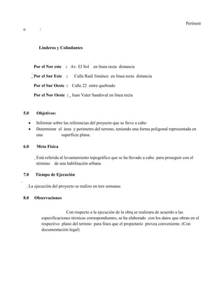 Este documento describe un levantamiento topográfico realizado en un terreno ubicado en la Avenida el Sol en Ciudad Nueva, Tacna. El objetivo del levantamiento fue determinar el área y perímetro del terreno para facilitar el desarrollo de servicios como electricidad y desagüe. El ingeniero Constantino Pimentel recibió el encargo de realizar el levantamiento topográfico, el cual se completó en tres semanas.