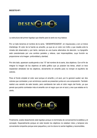 El documento describe el diseño gráfico creado para la serie "Desenfocados", incluyendo el logotipo y elementos de promoción. Se presentaron varias ideas iniciales para el logotipo antes de decidirse por mostrar una cámara de video con la lente rota. El logotipo captura la esencia de la serie de una manera simple y efectiva. Los elementos de promoción como flyers, calendarios, marcadores y pegatinas utilizan el mismo concepto gráfico para promover la serie de manera económica.