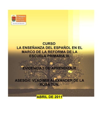Este documento presenta tres productos resultantes de un curso sobre la enseñanza del español en el marco de la reforma de la escuela primaria. El primer producto describe la experiencia de los maestros con los programas de estudio 2009 de español. El segundo producto discute la importancia de integrar las modalidades de trabajo en la planeación de proyectos didácticos. El tercer producto analiza el papel de los libros de texto y otros materiales en el aprendizaje de los alumnos.