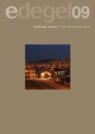 Este informe anual y de sostenibilidad de Edegel resume su desempeño en 2009, incluyendo logros económicos, ambientales y sociales. Generó 7,581 GWh para clientes regulados y libres, obteniendo un margen operativo de 383.8 millones de soles. Continuó invirtiendo en generación de energía limpia y en programas de responsabilidad social. El directorio destaca el compromiso de Edegel con el desarrollo sostenible.