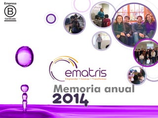 Ematris Ltda. es una empresa consultora chilena con más de 9 años de experiencia en potenciar la innovación y el emprendimiento. En 2014, Ematris expandió su alcance geográfico, aumentó en un 88% el número de proyectos realizados, y obtuvo la certificación de CORFO para realizar estudios de mercado e IP. La empresa también implementó varios programas de formación y talleres para emprendedores.