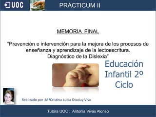 Este documento presenta un proyecto de intervención para mejorar los procesos de enseñanza y aprendizaje de la lectoescritura en un centro educativo. El proyecto incluye una evaluación e diagnóstico de alumnos con dificultades en la lectoescritura, así como una intervención adaptada y un plan de mejora basado en un enfoque constructivista colaborativo. El documento describe el contexto, los fundamentos teóricos y metodológicos del proyecto, y los pasos llevados a cabo, incluyendo la