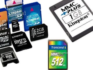 La memoria flash es un tipo de memoria EEPROM que permite escribir o borrar múltiples posiciones de memoria al mismo tiempo mediante impulsos eléctricos, a diferencia de la EEPROM que solo permite una celda cada vez. Existen varios tipos de memorias flash como las tarjetas Secure Digital, Memory Sticks, Compact Flash y MultiMediaCard que se usan en cámaras, dispositivos móviles y otros aparatos electrónicos para almacenar datos de manera no volátil. Cada fabricante suele usar un formato propio