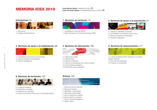La memoria ICEX 2010 destaca el apoyo a la internacionalización de las empresas españolas en un contexto de crisis económica, evidenciando un crecimiento en las exportaciones y una reducción significativa del déficit comercial. Se enfatiza la importancia de la diversificación geográfica de las exportaciones, el fortalecimiento de la cooperación institucional y la implementación de un ambicioso plan de promoción exterior que busca aumentar la base exportadora y mejorar la capacitación empresarial. Además, se resalta el uso de tecnologías para facilitar el acceso a la información y la necesidad de adaptarse a un entorno global competitivo.
