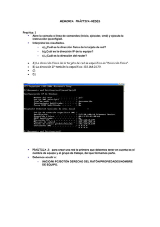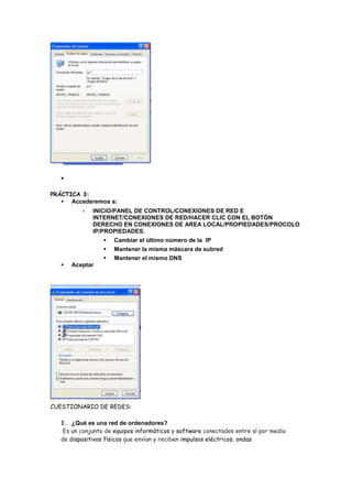 La práctica describe cómo realizar tres tareas de red básicas: 1) usar ipconfig para ver la dirección MAC, IP y de router, 2) configurar el nombre del equipo y grupo de trabajo, y 3) cambiar la dirección IP manteniendo la máscara de subred y DNS. Luego, el cuestionario explica conceptos clave de redes como protocolo TCP/IP, direcciones MAC e IP, y ventajas y desventajas de las redes.