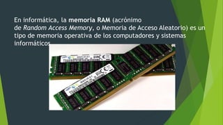 La memoria RAM es un tipo de memoria operativa temporal en computadores que permite el acceso aleatorio a la información sin un orden secuencial, se borra al apagado del sistema, y puede estar soldada a la placa base o en tarjetas removibles, almacenando programas y datos durante su uso.