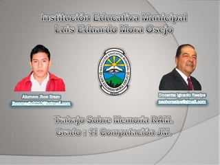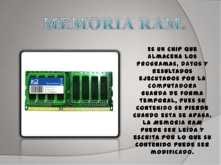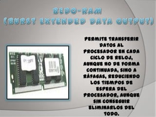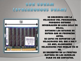 El documento describe la evolución de los diferentes tipos de memoria RAM utilizados en computadoras, desde la memoria síncrona más antigua hasta la memoria DDR más moderna. Comienza con la memoria síncrona de los primeros 386 y 486, luego pasa a describir las mejoras en velocidad y capacidad de la SDRAM, DDR SDRAM, DDR2 SDRAM y DDR3 SDRAM a medida que los procesadores se hicieron más rápidos. También cubre brevemente la memoria VRAM, RDRAM y SRAM.