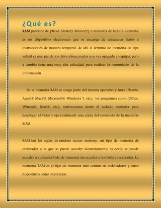 El documento proporciona información sobre diferentes tipos de memoria RAM, incluyendo RAM, SIMM, DIMM, RIMM, DDR, DDR2, DDR3 y DDR4. Explica las características clave de cada tipo y cómo fueron reemplazados por estándares más nuevos a medida que la tecnología avanzaba.