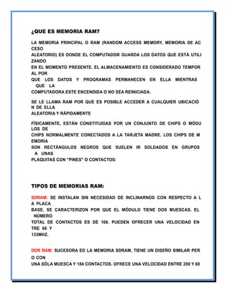 Este documento describe los diferentes tipos de memoria RAM que existen. Explica que la RAM es la memoria principal donde se almacenan temporalmente los datos y programas que está usando la computadora. Luego detalla los tipos principales de RAM como SDRAM, DDR RAM, DDR2 RAM, So-DIMM y RIMM, describiendo sus características como el número de pines, velocidades y capacidades.