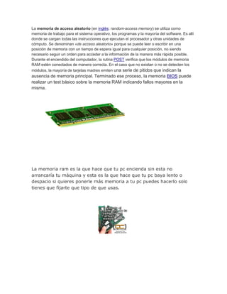 El documento habla sobre diferentes tipos de memoria RAM. Menciona SIMM, DIMM, RIMM, DDR1, DDR2, DDR3 y DDR4, explicando brevemente cada uno. La memoria RAM es fundamental para el funcionamiento de una computadora, almacenando instrucciones y datos temporales durante el uso.