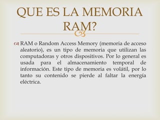 La RAM es memoria temporal que se usa para almacenar información de forma temporal. Ha habido varios tipos de RAM a través de los años, incluyendo FPM, EDO, SDRAM, DDR SDRAM, DDR2 SDRAM y DDR3 SDRAM, cada una con mejoras en velocidad y rendimiento. La RAM más reciente es la DDR3 SDRAM, que ofrece mayores velocidades y menores consumos de energía que las versiones anteriores.